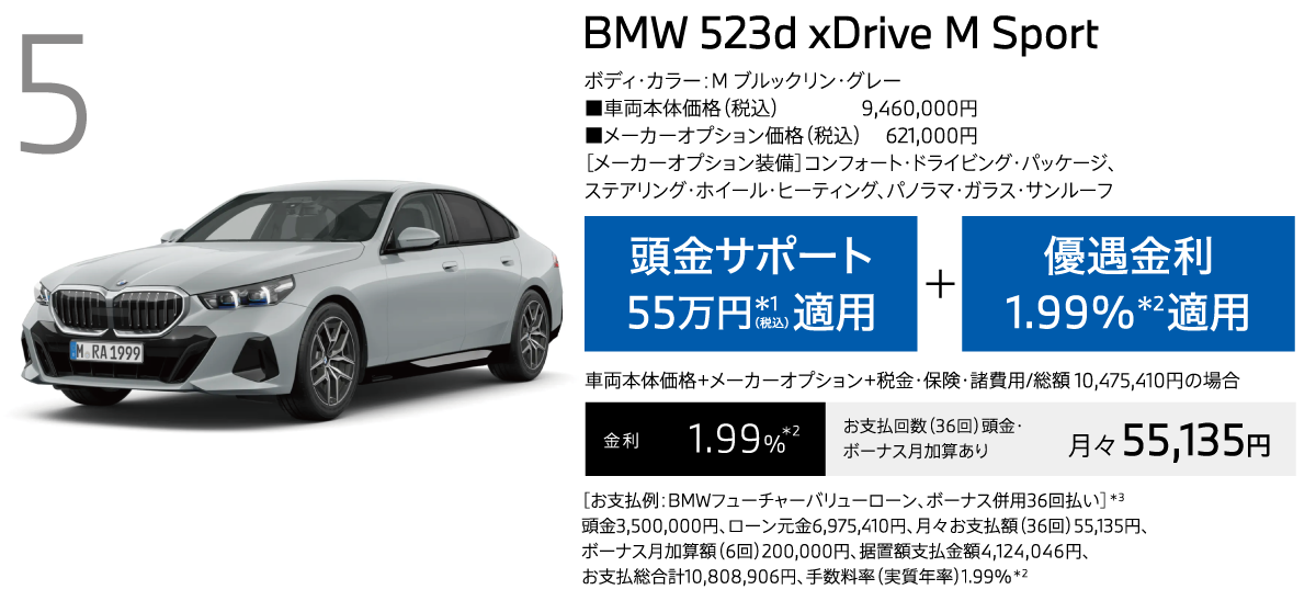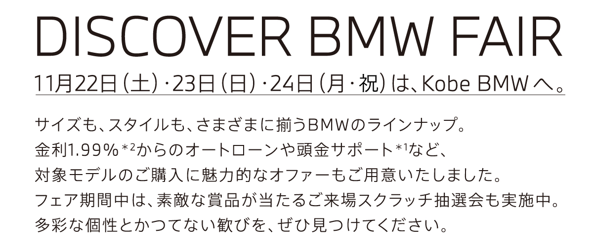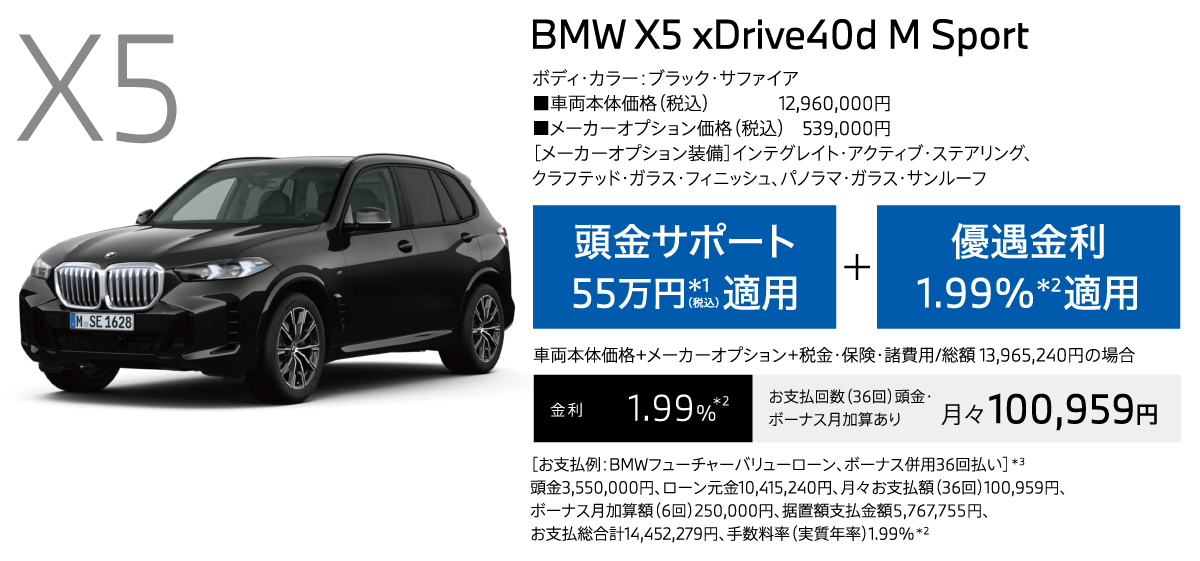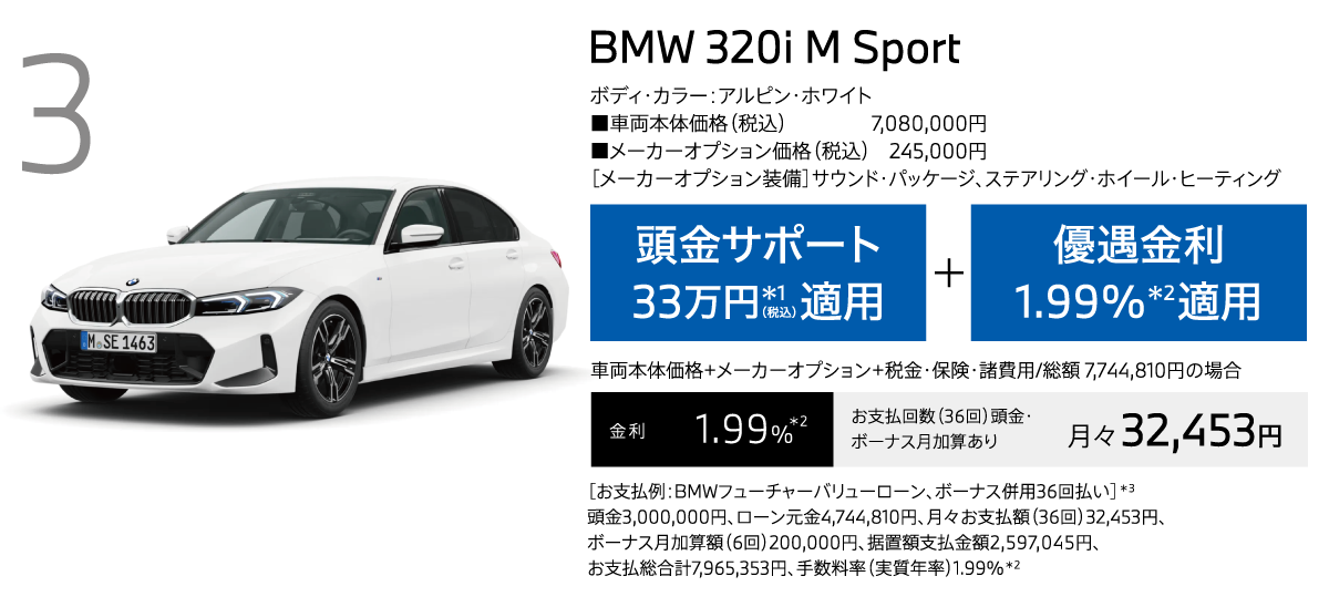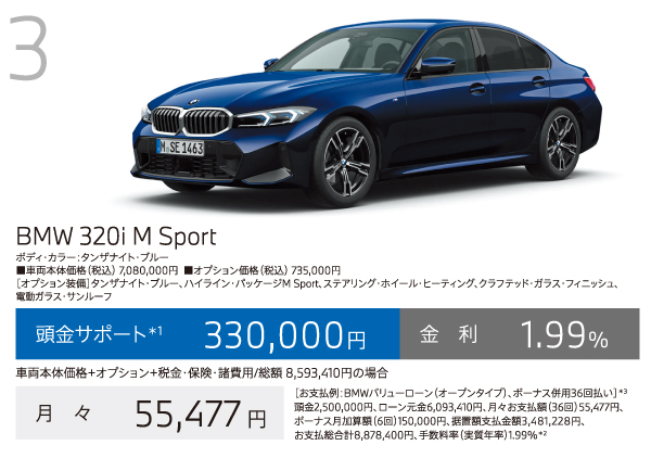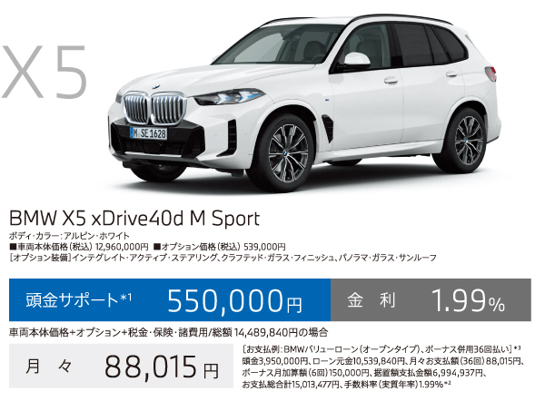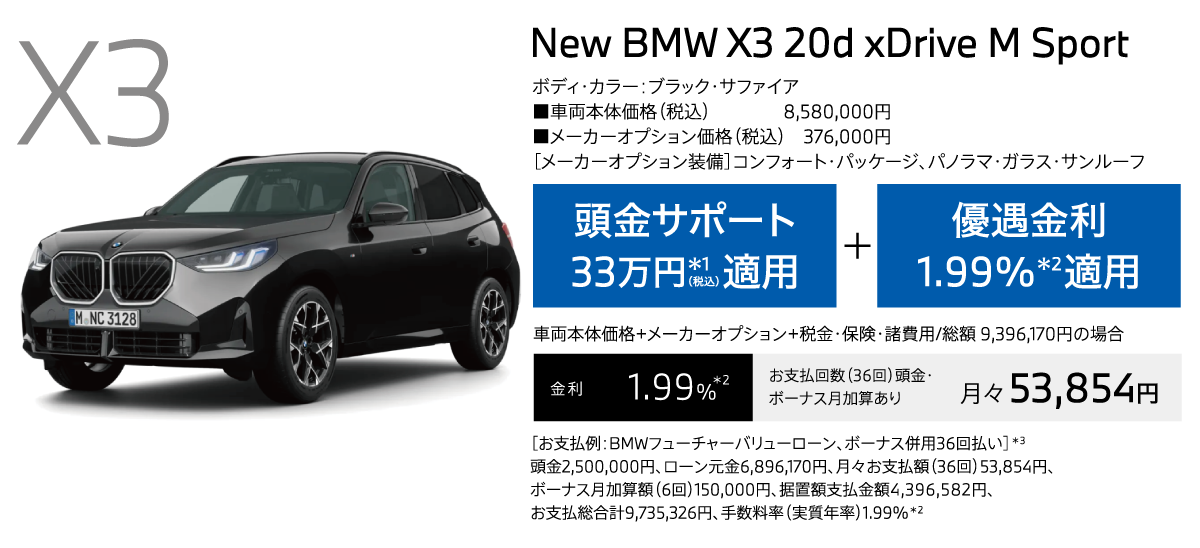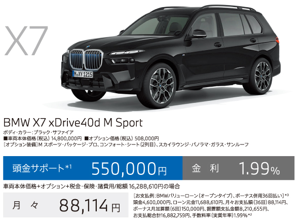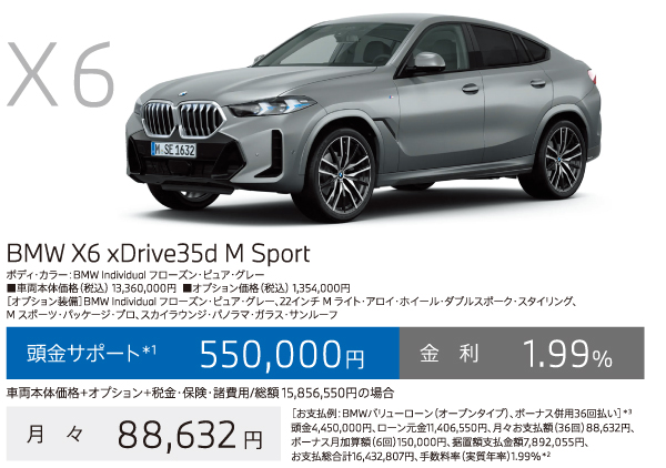 *1:頭金サポートは当社指定即納車両を10月末までにご登録、納車いただける方が対象。現金を提供するものではございません。表示の金額は税込です。*2:優遇金利1.99%は当社指定即納車両を10月末までにご登録、納車いただける方が対象。BMWオートローン(支払回数36回)をご利用いただいた場合に適用されます。金利は実質年率です。以上の内容は、予告なく変更する場合がございます。*3:掲載のお支払例は、車両本体価格(消費税込)+メーカーオプション+付属品+税金・保険・諸費用に基づいて算出したもので、あくまでも参考です。最終回は、据置額の再ローン契約(再ローン申込時に与信審査があります)、据置額の一括払いまたは車両返却による据置額ご清算がお選びいただけます。車両返却による据置額のご清算の際、一般財団法人日本自動車査定協会等(BMW正規ディーラーを含みます)の評価に基づく査定価格と据置額の差額分のご清算が必要となります。お支払例は年間走行距離6,000kmタイプの「BMWフューチャーバリューローン」で試算しております。お支払例は2025年10月現在の一例です。手数料率や据置額は変動するため、掲載の手数料率・据置額が適用されない場合があります。実際の手数料率およびお支払総合計等は、ショールームにお問い合わせください。以上の内容は、予告なく変更する場合がございます。※表示の価格は車両本体価格(消費税込)です。※価格および装備の設定等は、在庫車両の生産時期等により異なる場合があります。詳しくはショールームまでお問い合わせください。※車両本体価格(リース料を除く)には、税金(消費税を除く)、保険料、登録に伴う諸費用、付属品価格等は含まれません。※リース契約の場合を除き、リサイクル料金が別途必要となります。※価格は予告なく変更する場合がありますので、あらかじめご了承ください。※記載の諸元やデータは国土交通省届出値を基にしていますので、メーカー公表値と異なる場合があります。また、一部ヨーロッパ仕様車値を含みます。※掲載した写真の車は日本仕様とは異なります。また、オプション装備等を含む場合は車両価格が異なることがあります。※使用している写真は実際の色合いと異なる場合があります。※プロダクトに関する詳細はwww.bmw.co.jp、またはショールームにてご確認ください。※以上の内容は、予告なく変更、終了する場合がございます。※世界規模の半導体部品供給難等により、一部の標準装備やオプションの設定削除、およびパッケージ・オプションに含まれる装備の変更が発生しておりますこと、深くお詫び申し上げます。装備の設定や価格の詳細につきましては、ショールームまでお問い合わせください。※記載の内容は2025年10月現在のものです。