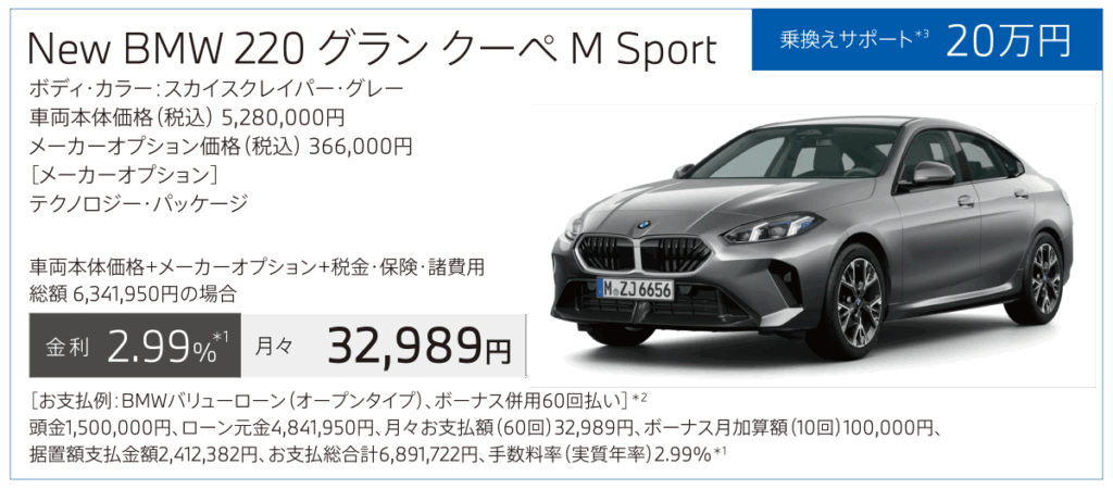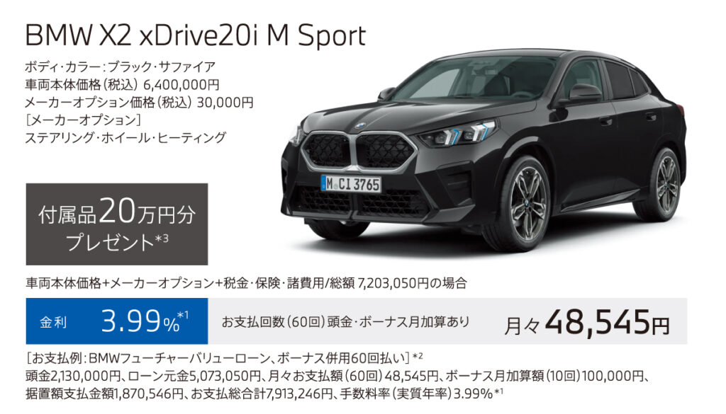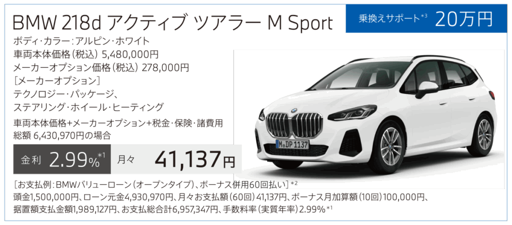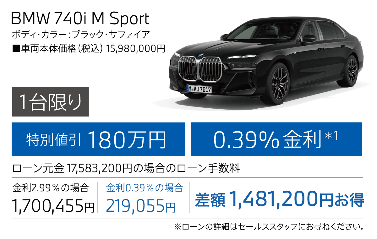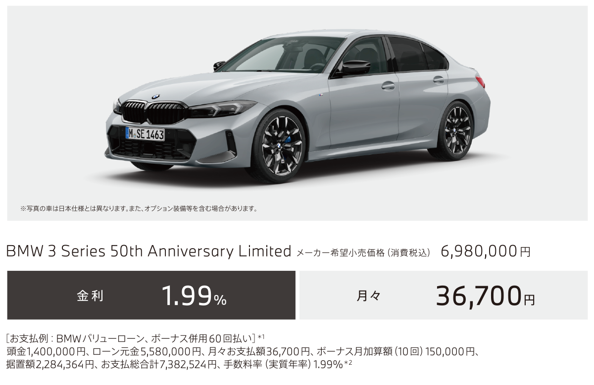 *1:金利は、当社指定の新車モデルのご購入にBMWフューチャーバリューローンまたはBMWオートリース(支払回数36回から60回払いまで)をご利用いただいた場合に適用されます。手数料率は実質年率です。以上の内容は、予告なく変更する場合がございます。*2:掲載