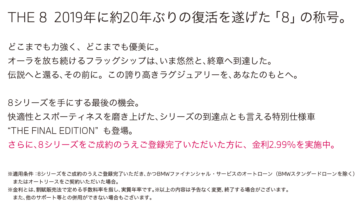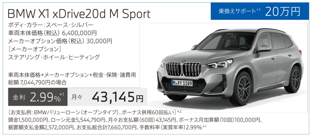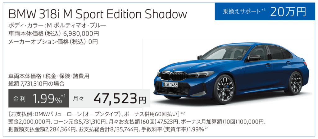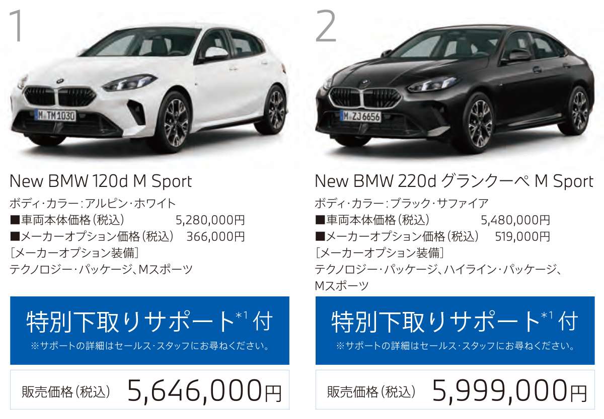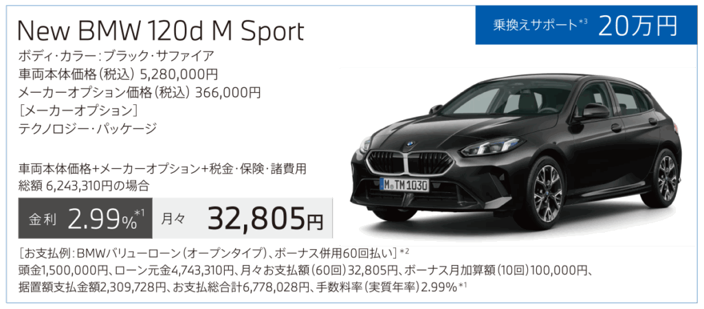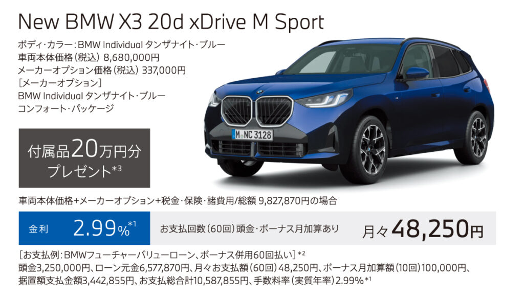 *1:金利は、当社指定の新車モデルのご購入にBMWフューチャーバリューローンまたはBMWオートリース(支払回数36回から60回払いまで)をご利用いただいた場合に適用されます。手数料率は実質年率です。以上の内容は、予告なく変更する場合がございます。*2:掲載
