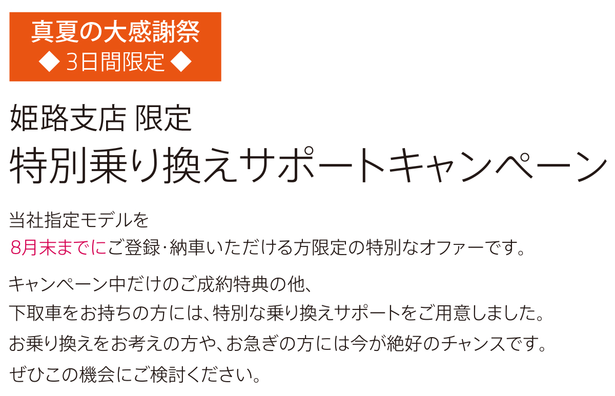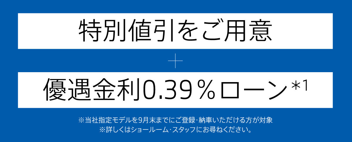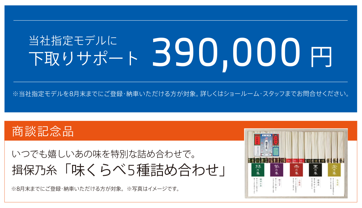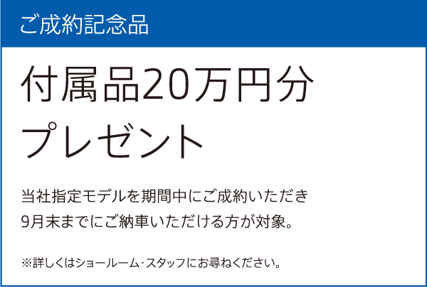 変更する場合がございます。*3:付属品20万円分プレゼントは当社指定モデルを期間中にご成約いただき、9月末までにご納車いただける方が対象となります。※表示の価格は車両本体価格(消費税込)です。※価格および装備の設定等は、在庫車両の生産時期等により異な