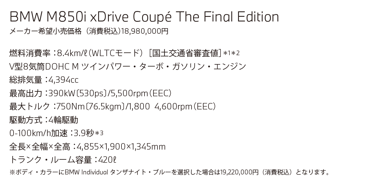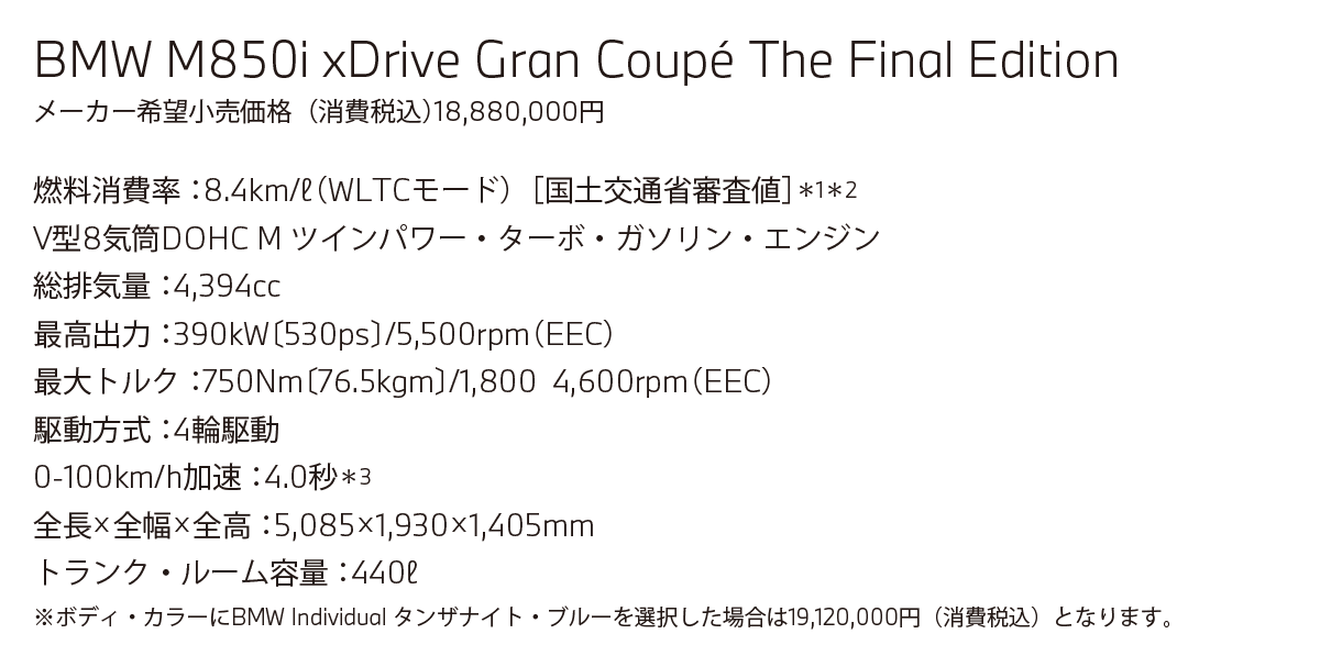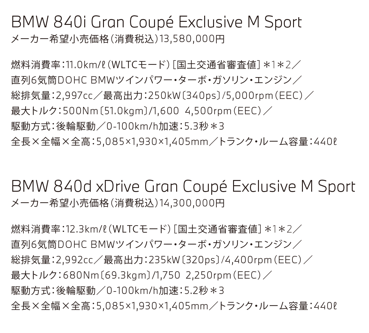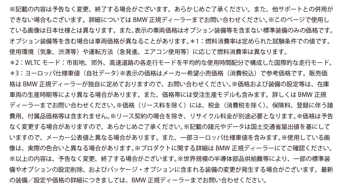 *1:燃料消費率は定められた試験条件での値です。使用環境(気象、渋滞等)や運転方法(急発進、エアコン使用等)に応じて燃料消費率は異なります。*2:WLTCモード:市街地、郊外、高速道路の各走行モードを平均的な使用時間配分で構成した国際的な走行モード。※表示の価格はメーカー希望小売価格(消費税込)で参考価格です。販売価格はBMW正規ディーラーが独自に定めておりますので、お問い合わせください。※価格および装備の設定等は、在庫車両の生産時期等により異なる場合があります。また、価格帯には受注生産モデルも含みます。詳しくはBMW正規ディーラーまでお問い合わせください。※価格(リース料を除く)には、税金(消費税を除く)、保険料、登録に伴う諸費用、付属品価格等は含まれません。※リース契約の場合を除き、リサイクル料金が別途必要となります。※価格は予告なく変更する場合がありますので、あらかじめご了承ください。※記載の諸元やデータは国土交通省届出値を基にしていますので、メーカー公表値と異なる場合があります。また、一部ヨーロッパ仕様車値を含みます。※使用している写真は印刷物のため、実際の色合いと異なる場合があります。※プロダクトに関する詳細はwww.bmw.co.jp、またはBMW正規ディーラーにてご確認ください。※以上の内容は、予告なく変更、終了する場合がございます。※世界規模の半導体部品供給難等により、一部の標準装備やオプションの設定削除、およびパッケージ・オプションに含まれる装備の変更が発生する場合がございます。最新の装備/設定や価格の詳細につきましては、BMW正規ディーラーまでお問い合わせください。※記載の内容は2025年9月8日現在のものです。