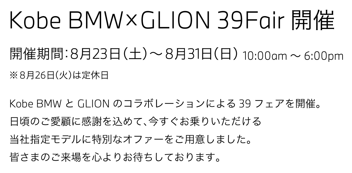 • Kobe BMW×GLION 39Fair期間中だけの特別なオファーをご用意しました。