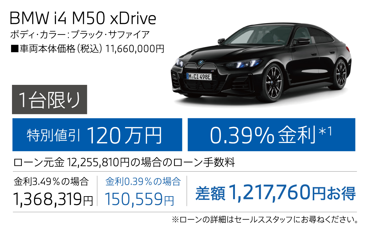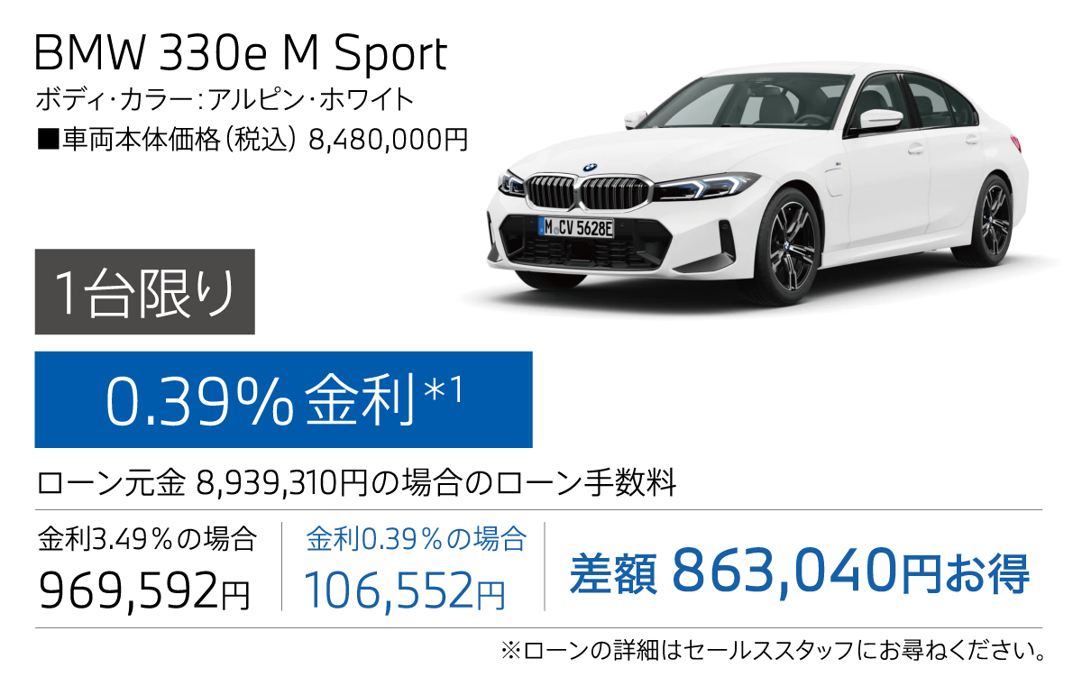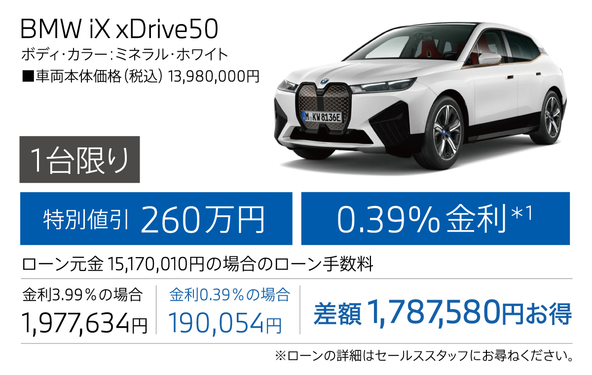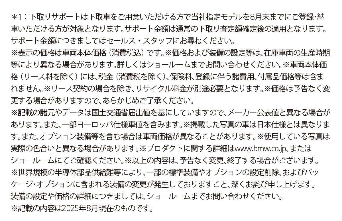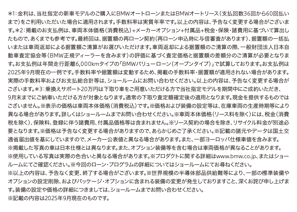 *1:優遇金利0.39%は当社指定モデルを9月末までに登録・ご納車を完了いただける方が対象。BMWファイナンシャル・サービスのオートローンを60回払いまで、またはオートリースをリース期間5年間までのご契約、および当社指定モデルのご契約に限ります。金利は実質年率です。※表示の価格は(消費税込)です。※車両本体価格には、税金(消費税を除く)、保険料、登録に伴う諸費用、オプション価格、付属品価格等は含まれません。※リサイクル料金が別途必要となります。※価格は予告なく変更する場合がありますので、あらかじめご了承ください。※記載の諸元やデータは国土交通省届出値を基にしていますので、メーカー公表値と異なる場合があります。また、一部ヨーロッパ仕様車値を含みます。※掲載した写真の車は一部日本仕様と異なります。また、オプション装備等を含む場合があります。※使用している写真は実際の色合いと異なる場合があります。※車両充電時には、充電スタンドや充電ケーブルに近づかないでください。※充電により動作に影響を与えるおそれがありますので、植込み型心臓ペースメーカーおよび除細動機能なし植込み型両心室ペーシングパルスジェネレーターを装着されているお客様は、車両充電の操作はご自身ではなさらず他の方にお願いしてください。※プロダクトに関する詳細はwww.bmw.co.jp、またはBMW正規ディーラーにてご確認ください。※以上の内容は、予告なく変更、終了する場合がございます。※記載の内容は2025年8月現在のものです。