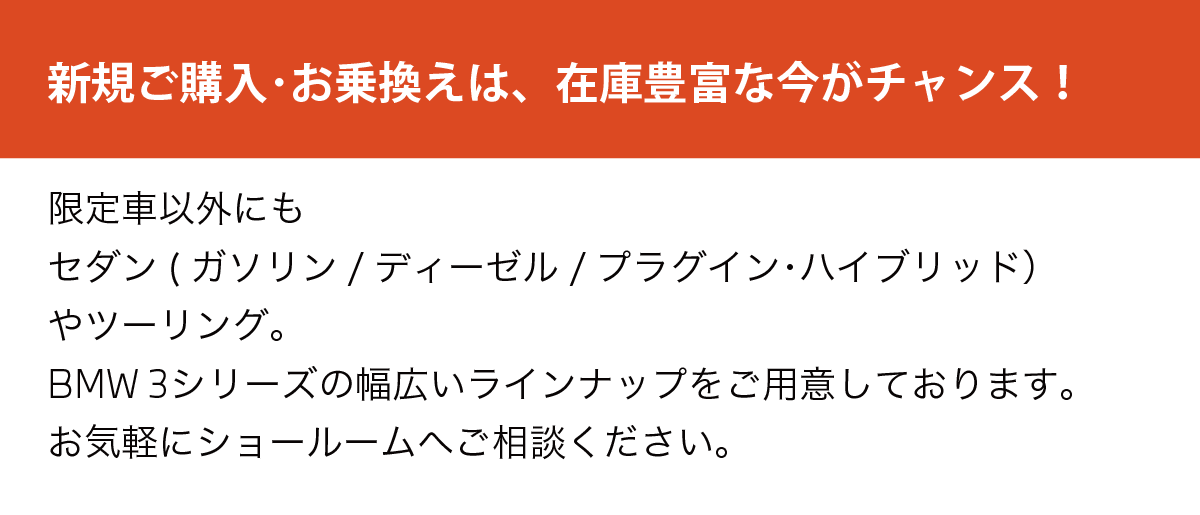装備等を含む場合は車両価格が異なることがあります。※使用している写真は実際の色合いと異なる場合があります。※プロダクトに関する詳細はwww.bmw.co.jp、またはショールームにてご確認ください。※今回のローン・プログラムの詳細についてはショールームにてお尋